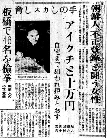 話題の女性は荒川区役所総務課勤務小松シマさん(40)ですでに同区役所所に十年間勤めている人、廿五年三月に行われた第二回の登録切替え当時は占領下でもあり朝鮮人の圧力は今度の場合よりはるかに強く、第三国人という「特権」をふりかざして高圧的に出て、この手がきかぬとみると今度は係員の買収に取りかかり、