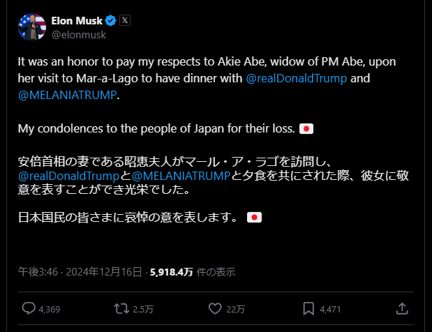 Elonさんに哀悼の意を表された日本
